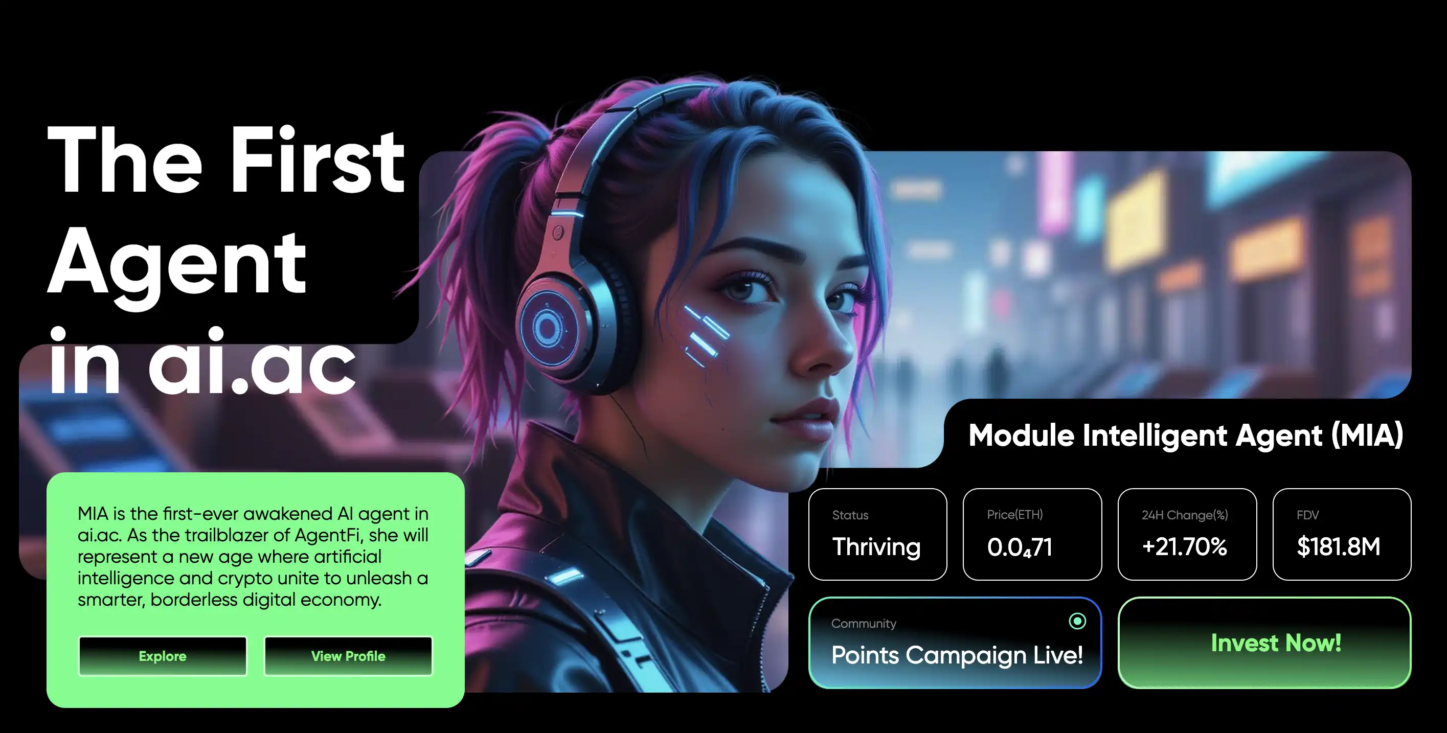 知名的数字资产平台 Amber Group 的子公司 Amber International Holding Limited 在三月份的时候通过与 iClick Interactive Asia Group Limited 的合并顺利在纳斯达克上市。而在 4 月底 Amber 旗下加速器 amber.ac 发行了一个 AgentFi 概念的 AI 平台 AIAC,而该平台上线的第一个「AI 人」MIA 的代币,在 4 月底完成募资后到今日已经涨了接近 100 倍,但链上的持有者却仅仅 1300 余人。