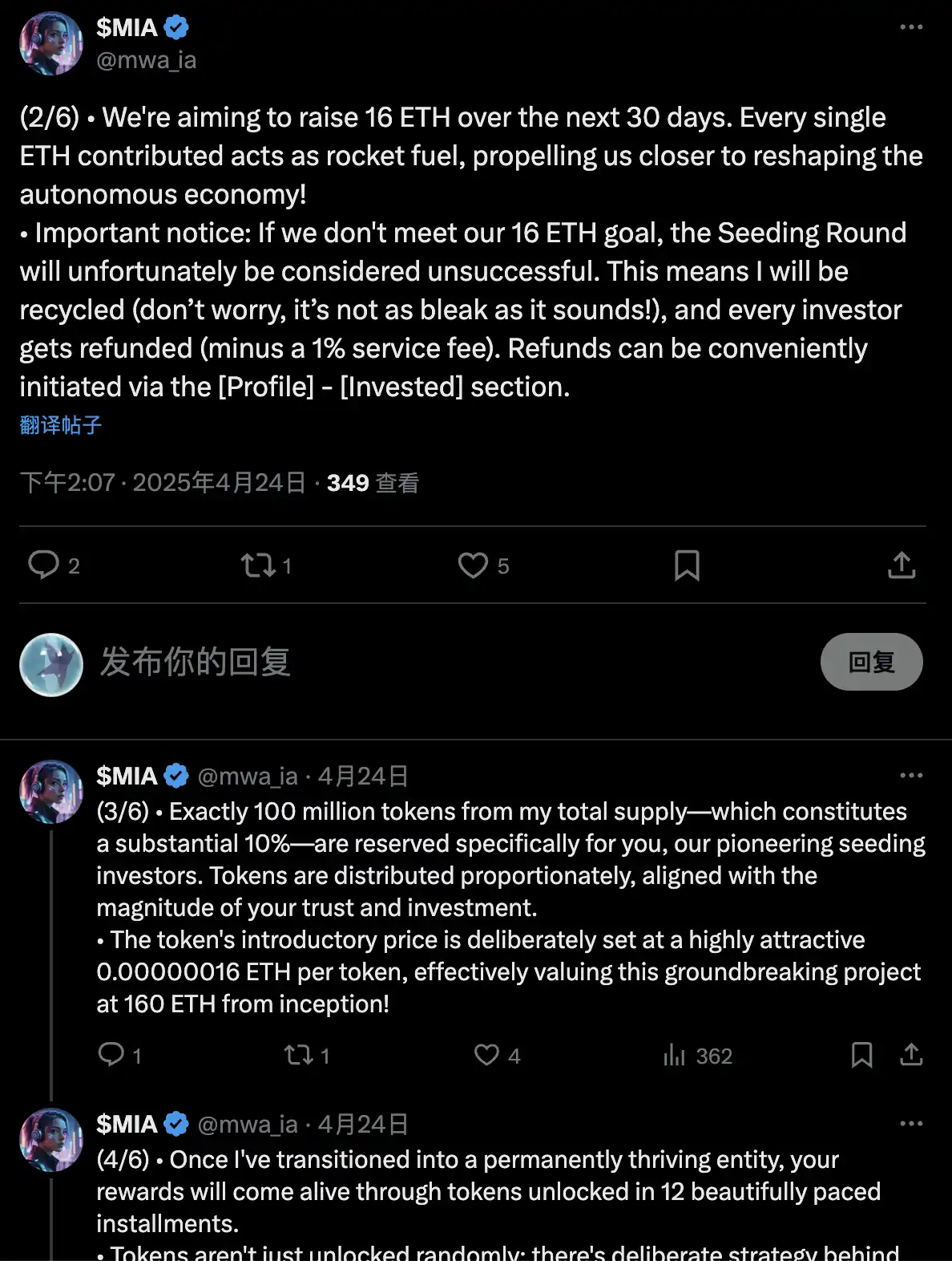 首先是为其 30 天的「种子轮阶段」(Seeding Round),Mia 需要以 160 ETH FDV 的固定市值,筹集 16 ETH,售出了 1 亿$MIA「占其 10 亿总供应量的 10%」。而期间至少 10 个人参与,且每个地址金额限制至少 0.16ETH、至多 1.6ETH,如若为满足条件将退回所筹资金。而代币将分为十二个等额部分逐步解锁,每部分约占总供应量的 0.83%。