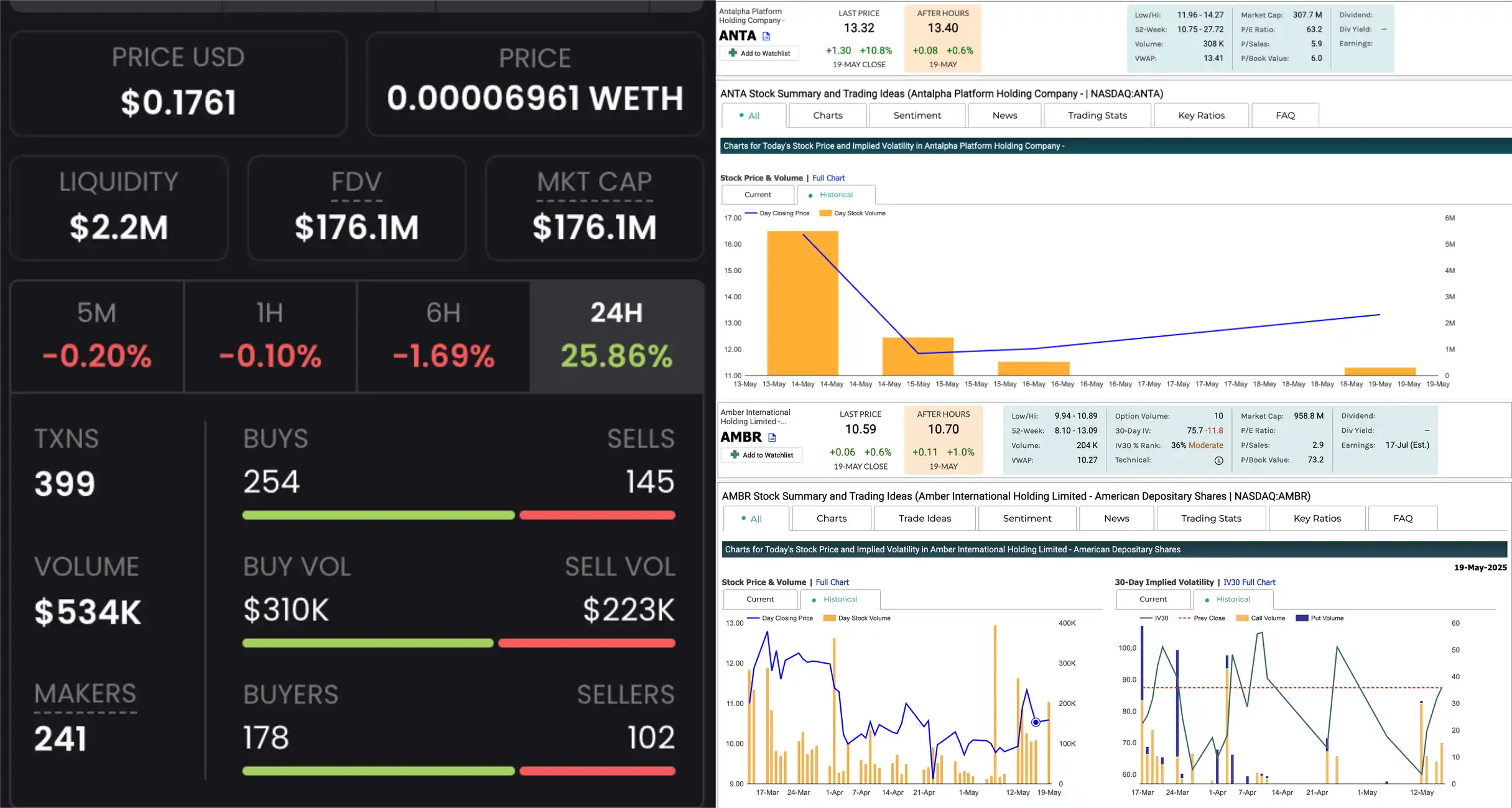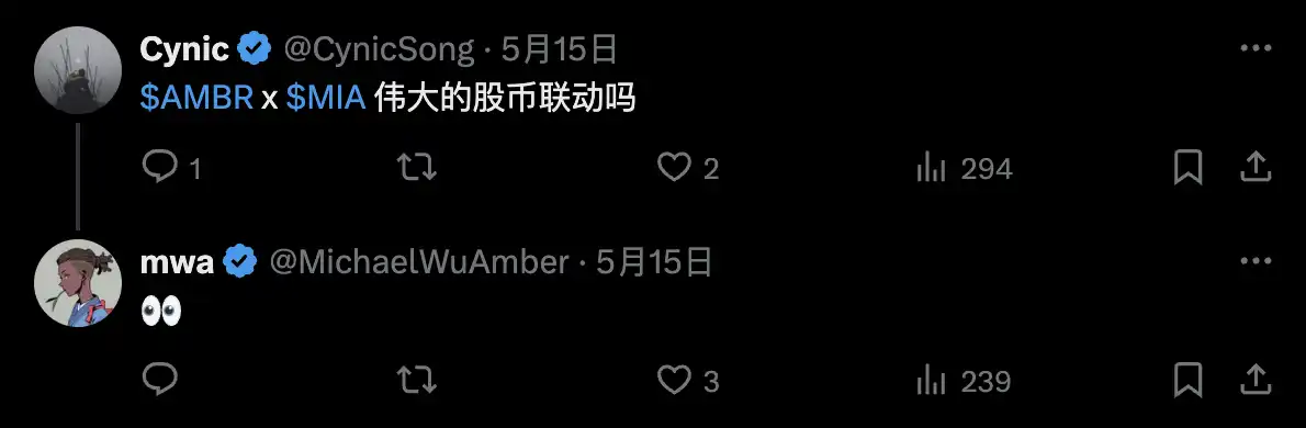 而当社区对 MIA 进行讨论之时,加密 KOL RUI「YeruiZhang」发文惊叹,当前 Amber Group「AMBR」的市值已经达到了 Antalpha 的三倍,但其股票的日交易量却仅为 Antalpha 的三分之一。而更令人玩味的是,Amber 发射的 AI 项目 MIA「$MIA」的链上交易量与流动性,甚至已经超越其美股主板股票本身,成为 Amber 资本叙事中的一个「高流动性锚点」。