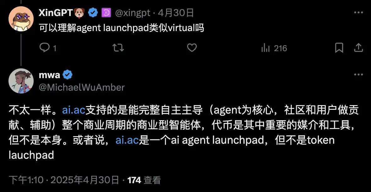 而当第一眼看到 AIAC 时,许多人都会认为这与 Virtual 的模式十分相像,当社区问道同样的问题时,Amber 的 CEO Michael 对此的答复则是,「AIAC 是一个 AI Agent 的发射平台,而不是代币的发射平台」。