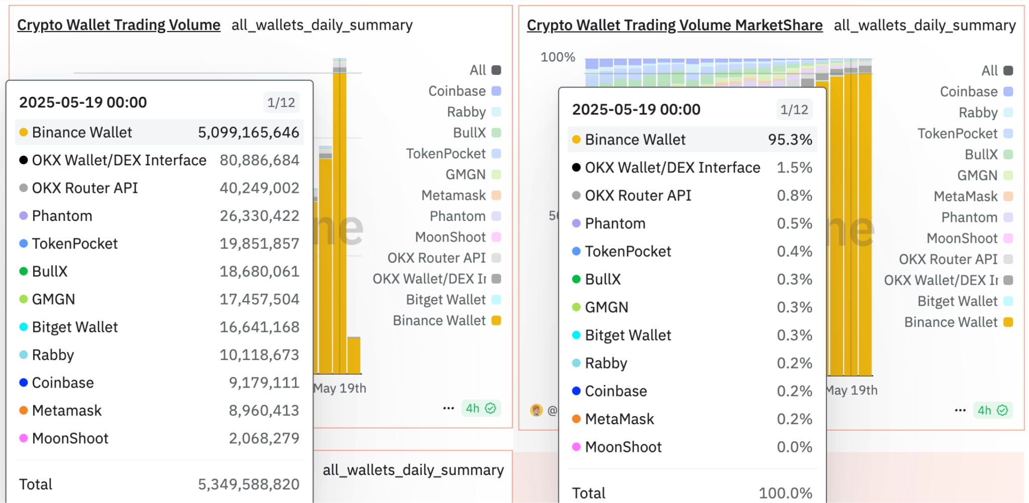 全球领先区块链生态系统及加密货币交易平台 Binance 宣布,其一站式 Web3 钱包——Binance 钱包单日交易量突破 50 亿美元,在 Dune Analytics 追踪的 12 个主流钱包中,占据 95.3% 的市场份额,创下全新里程碑。