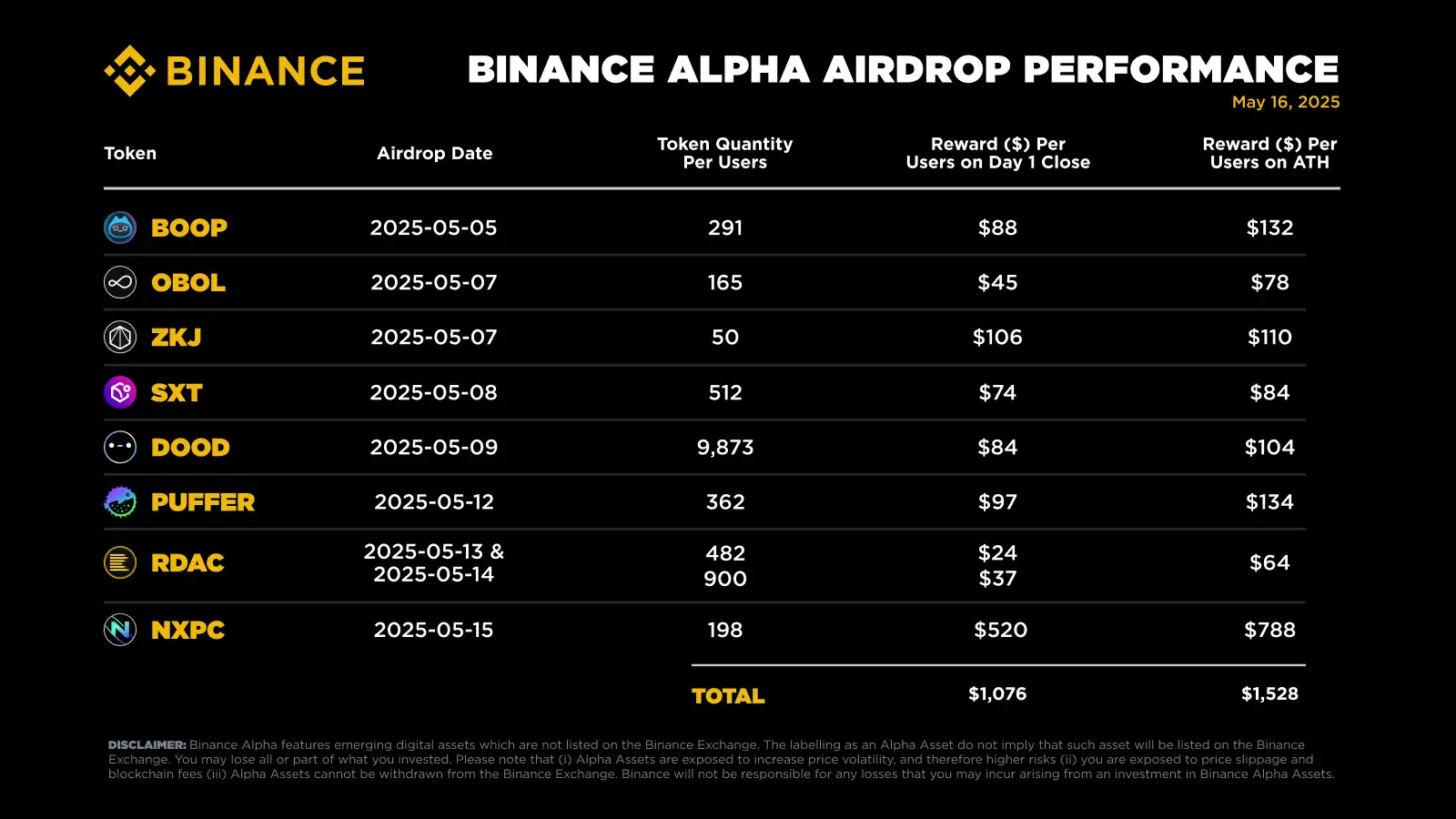 · Alpha 平台空投奖励:Binance Alpha 也通过持续空投激励活跃用户。自 2025 年 5 月起,Alpha 已向用户分发 8 轮代币空投,以上线首日收盘价计算,人均获得价值约 1,076 美元的奖励。
