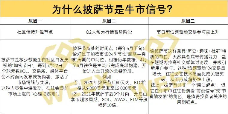 从表面看,披萨节只是一个纪念加密历史的轻松节日,但从历史行情中,我们却能捕捉到某种「集体市场节奏」的暗示。回顾历年的走势不难发现,披萨节常常发生在牛市周期的中前段,而非顶部,具备一定的前瞻性意义。