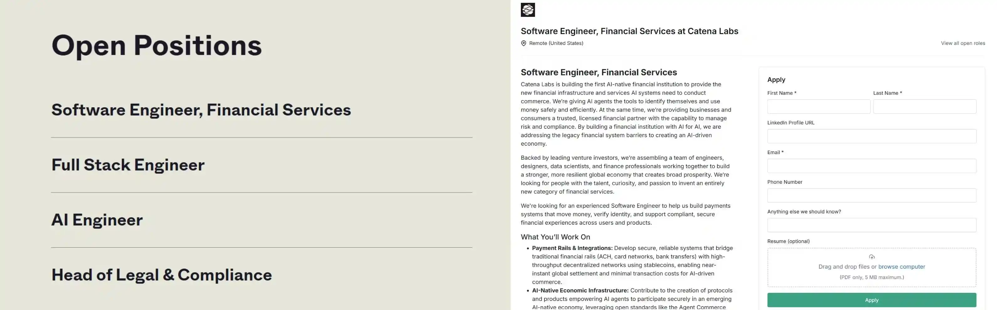 目前 Catena Labs 成员仅 9 人,都来自 Meta、Google、Jump Crypto 和 Protocol Labs 的世界级团队,其官网可以直接投递 简历,可见团队也积极面向世界招揽人才。