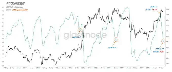 从 5 月 7 日-5 月 14 日,BTC 的筹码集中度在短短 7 日内从 15.5% 的高点下降到 8.2%。说明随着价格的拉升,已逐渐远离了筹码集中区。如果集中度曲线继续下降,大概率伴随的是价格继续拉升。