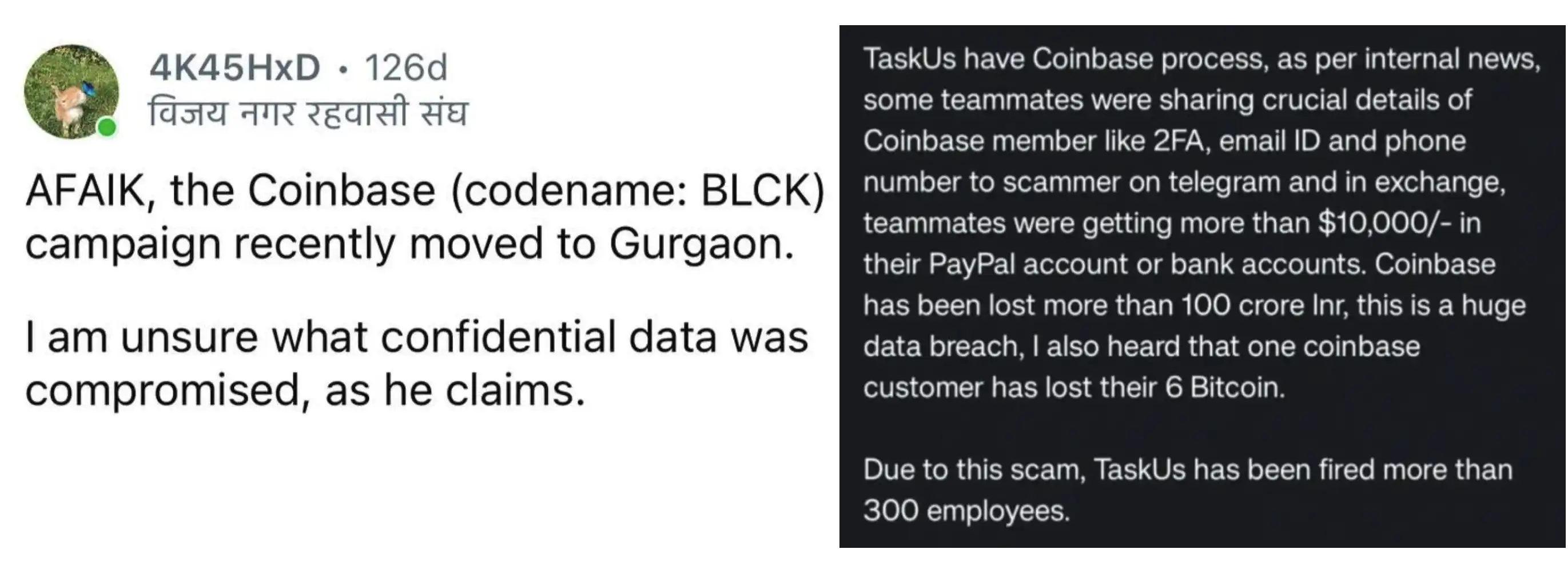 Taylor Monahan 还直接揭露:Coinbase 大规模外包了客服工作给印度的第三方服务商 TaskUs。早在 2025 年 1 月 11 日,Coinbase 大规模裁员开除了 300 多名印度客服,理由就是「盗窃」与「违规操作」。随后办公室迁到古尔冈城市,但内部数据泄露依然频繁发生,于是 3 月和 4 月又发生了新一波的「裁员」。
