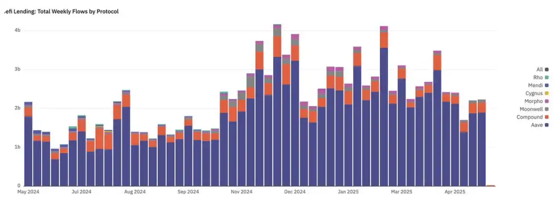 从图中可以看出,Aave 在借贷市场中占据了绝对的主导地位,占据了所有借款中的 85.75%。