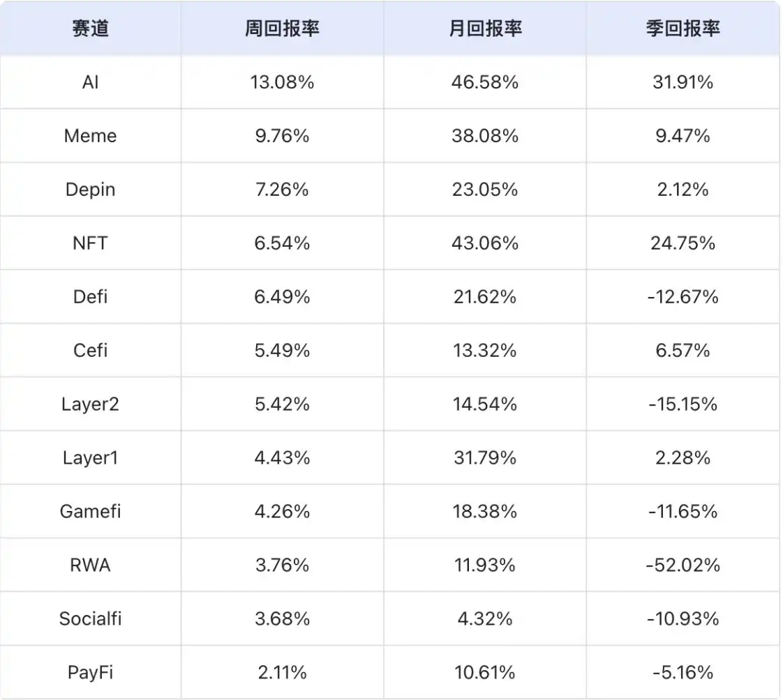 按周回报率统计,AI 赛道表现最佳,而 PayFi 赛道表现最差。