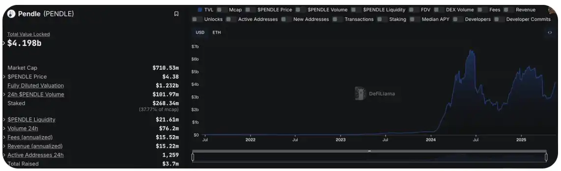 从图中可知,Pendle 的 TVL 达到了 41.98 亿美元的规模,虽然并没有处于其项目的最高峰时期,但是其 TVL 的向上曲线也可以看出 Pendle 的业务规模正处于快速恢复的阶段。