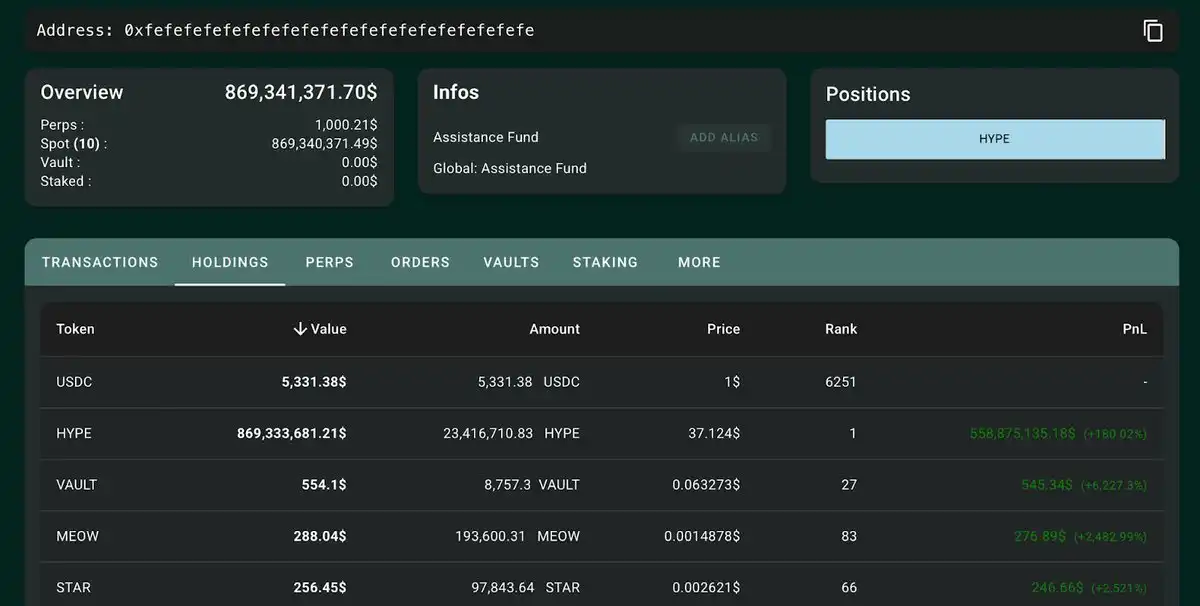 Hyperliquid 援助基金 - HYPE 持有量近 9 亿美元 - Hypurrscan