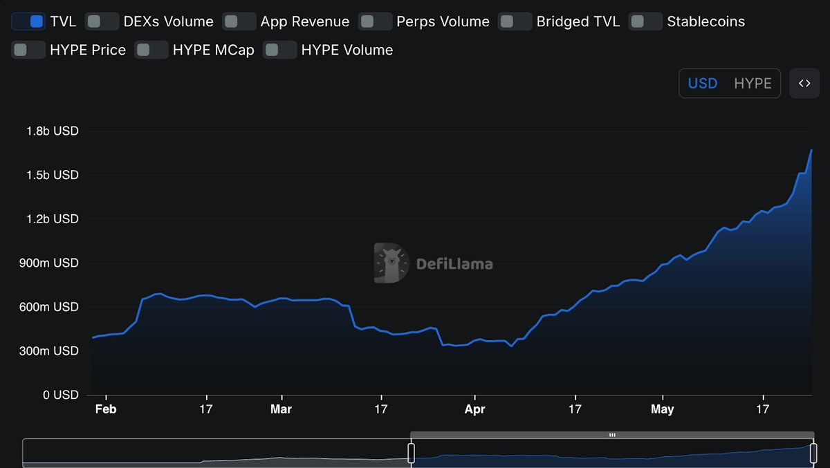 用户利用 HyperEVM 协议作为暂停高风险交易时的被动收益来源,同时也作为无法直接在 HyperCore 上用作抵押品的资产(如 HYPE、UBTC、UETH 和 HYPE LSTs)的流动性场所。随着 HyperEVM 借贷市场、DEXes 和 LSTs 的扩展,我们见证了多种新稳定币的出现,首先是 CDP 稳定币,如 @felixprotocol 的 feUSD 和 @hypurrfi 的 USDXL,随后是 @ethena_labs 的 USDe 以及 5 月初的 USDT0。这些稳定币为 HyperEVM 生态系统中更复杂的基于稳定币的杠杆产品奠定了基础。