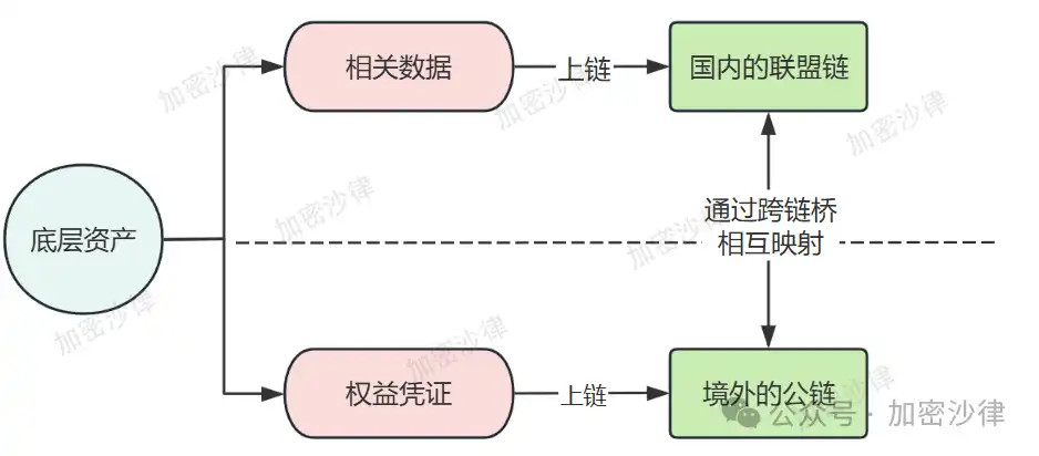 由于我国目前对于跨境数据传输以及数据交换领域的严格监管,因此大部分 RWA 项目并不会选择将相关数据传输到境外并且在公链上进行流转和披露。加密沙律团队在研究过程中发现,在满足我国《数据安全法》《个人信息保护法》合规要求的前提下,项目方更倾向于选择「两链一桥」模式实现数据上链。