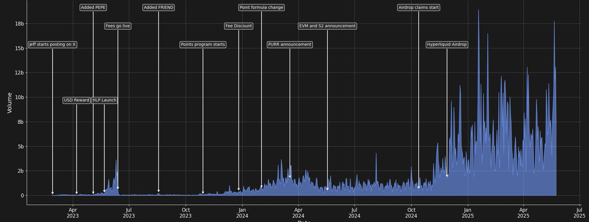 效果也很明显。Hyperliquid 的日交易量从 2023 年 3 月初的 300 万美金,迅速增长到月底的 5000 万。这种高强度、持续性的内容输出,为今天 Hyperliquid 的「信仰社群」打下了基础。