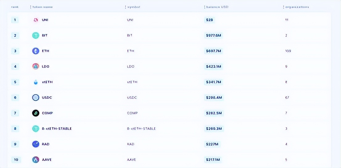 按 Token 持有量排名前十的 Token(资料来源:DeepDAO 截止 2022.3.12)