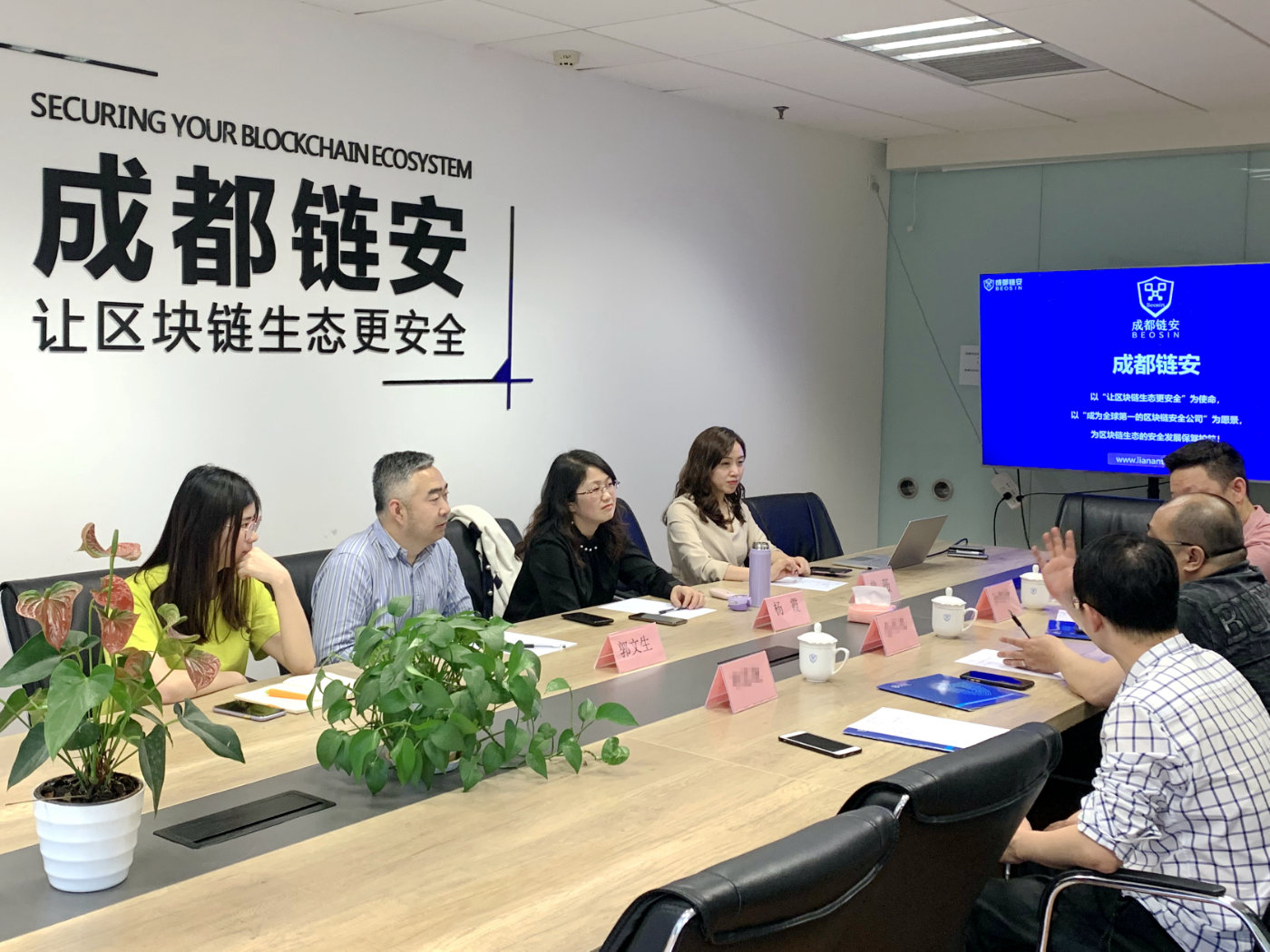 成都链安创始人&CEO 杨霞教授,成都链安创始人&CTO 郭文生教授,成都链安副总裁&战略发展总监 曾薇女士,以及市场部相关人员热情接待了亚马逊高管一行,并组织座谈。