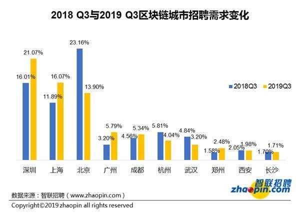 2019年三季度,区块链招聘需求城市分布中,深圳、上海、北京位于第一梯队,招聘人数占比分别达到21.07%、16.07%、13.9%,广州和成都紧随其后,分别占比5.79%、5.34%。其中深圳招聘需求占比较去年同期提高5.06个百分点,赶超北京,位居第一。深圳区块链发展走在前列,2018年8月全国首张区块链电子发票在深圳开出,深圳作为区块链技术最先落地应用的城市,经过一年的发展,其在区块链技术发展方面的领先地位开始凸显。